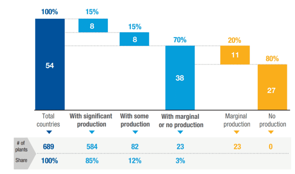 Note: “With significant production”: above 30 plants; “With some production”: between 5 and 30 plants; “Marginal production”: below 5 plants. In the absence of systematic data on African production facilities, this mapping (from Banda et al., 2022) uses information from company websites, industry contacts, and networks. While precise numbers may vary due to uncertainties, the relative scales of production across countries (e.g., whether a country has significant, some, or marginal production) are reliable for analytical purposes. Due to lack of data, 11 countries – mostly small – were not mapped in the original analysis. For simplicity and completeness, they are included here under the assumption that they have no production facilities, based on empirical evidence from similar countries. Excluding them would not alter the underlying findings of the analysis.